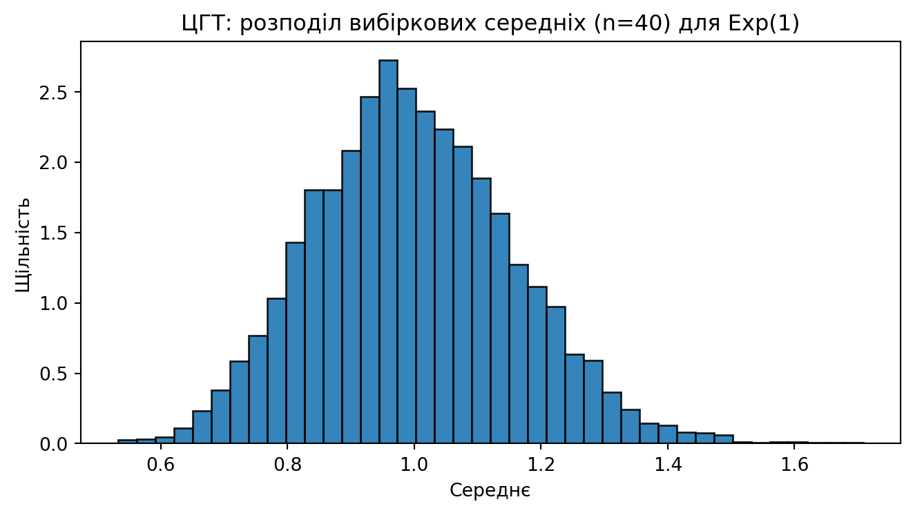 - **Центральна гранична теорема** — нормальність розподілу вибіркового середнього для достатньо великих вибірок.