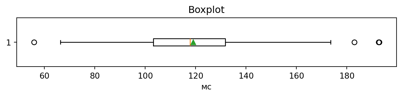 plt.xlabel("мс"); plt.title("Boxplot")