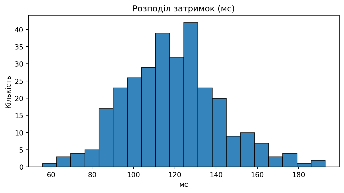 #| fig-cap: "Гістограма затримок (мс)"