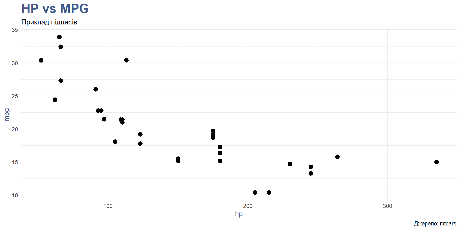theme() — детальне ручне налаштування елементів (наприклад, axis.text, legend.position тощо).